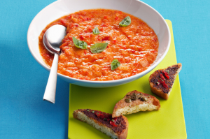 piatto-servito-cucchiaio-crostini-tovaglietta-verde-sfondo-azzurro-pomodoro-ricette-gratis-facili